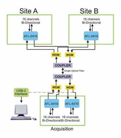 AFL-6400 可配置為遠程數(shù)據(jù)采集系統(tǒng),在 PC 站點上使用 USB2 接口,在遠程站點上使用 AFL-6400。兩個站點之間的距離可能長達 50 公里。